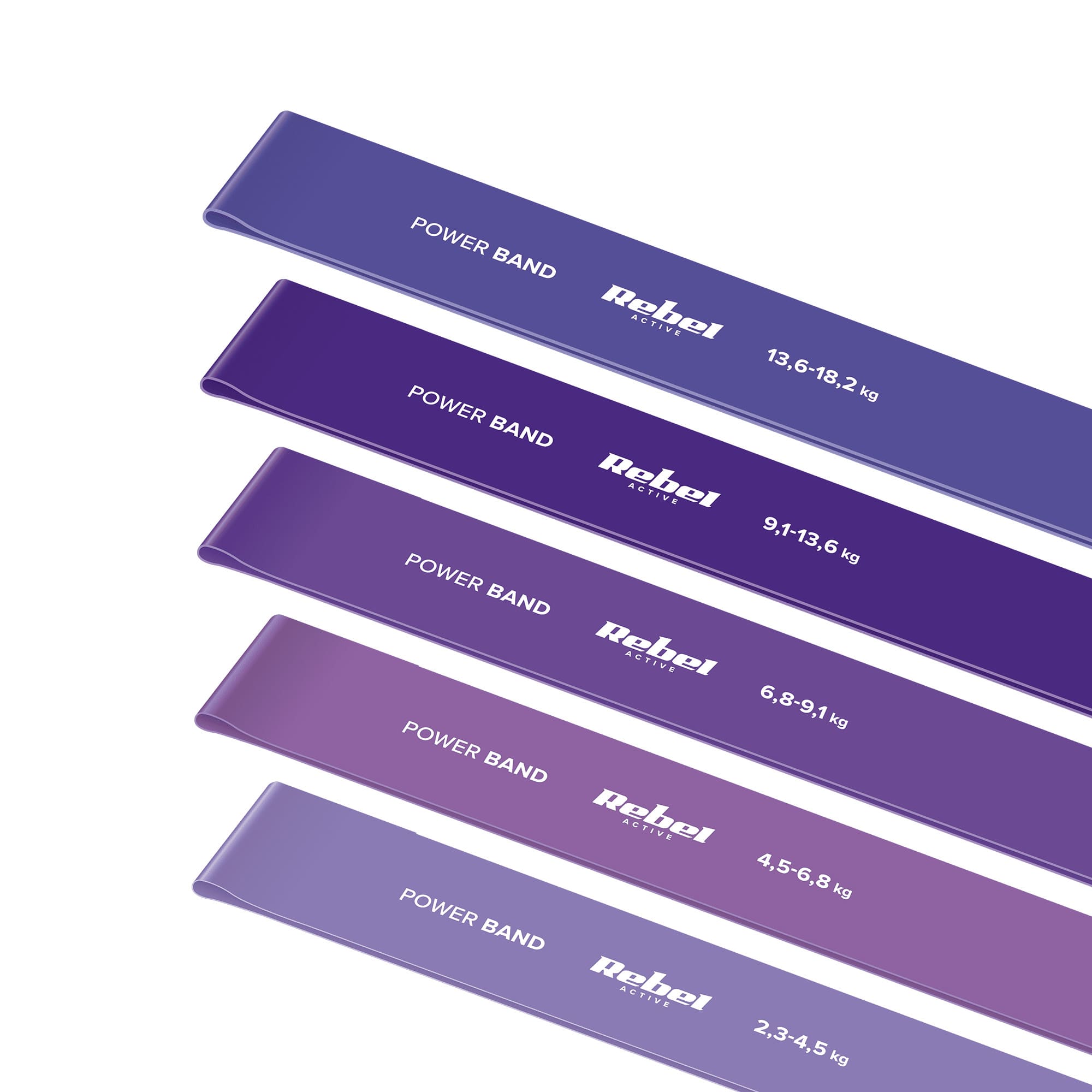 Latex exercise belt set – Mini Band L, 2.3-18.2 kg, 5 rubber bands, purple, REBEL ACTIVE